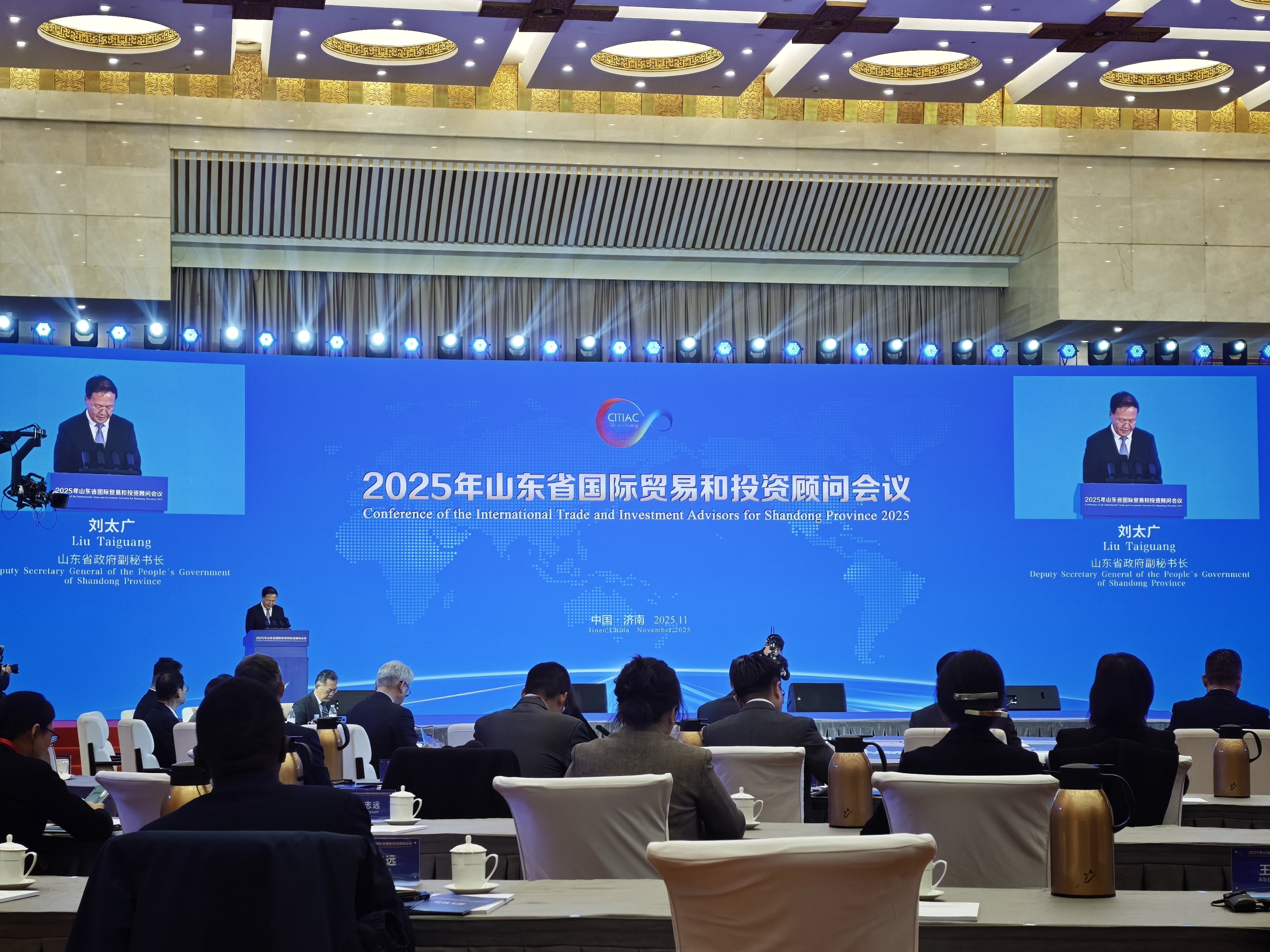 11月24日上午,2025年山东省国际贸易和投资顾问会议在山东大厦召开,市贸促会党组书记、会长齐怀栋出席会议。