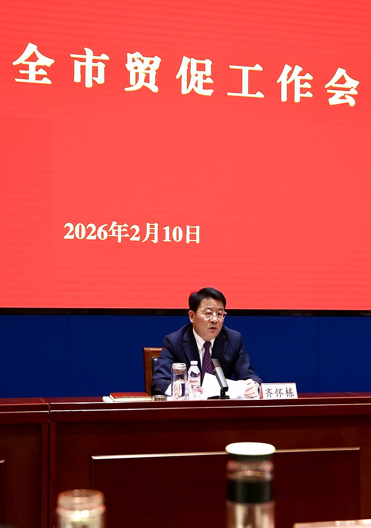 2月10日下午,2026年全市贸促系统工作会议在龙奥大厦召开。会议以习近平新时代中国特色社会主义思想为指导,全面贯彻党的二十大及二十届历次全会精神,认真落实中央和省、市经济工作会议部署,总结2025年及“十四五”时期全市贸促工作成效,分析当前发展形势,部署2026年重点任务,谋划“十五五”贸促事业发展方向。市贸促会党组书记、会长齐怀栋出席会议并讲话,市贸促会党组成员、副会长滕志超主持会议。