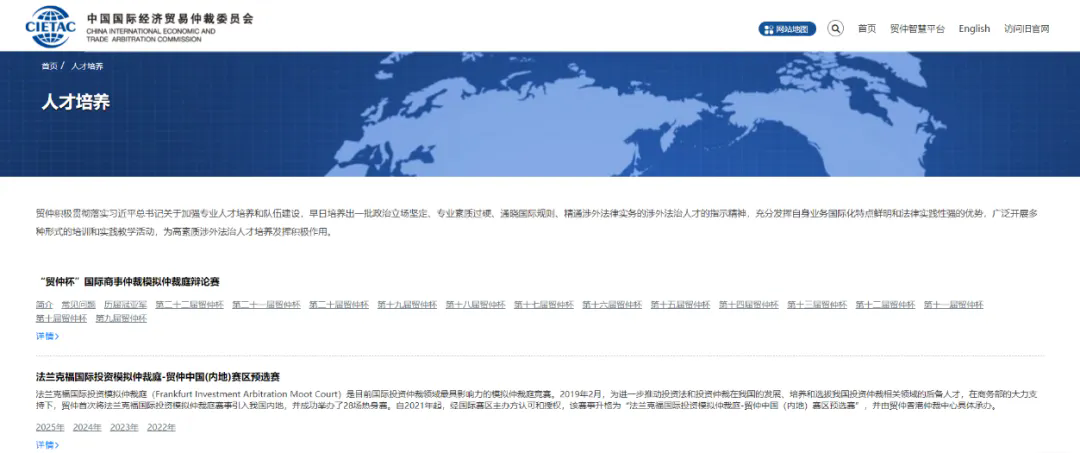 “人才培养”板块整合了历届“贸仲杯”国际商事仲裁模拟仲裁庭辩论赛、法兰克福国际投资模拟仲裁庭-贸仲中国(内地)赛区预选赛、中国青年仲裁论坛暨“中伦杯”国际商事仲裁征文大赛、贸仲国际仲裁研究院系列课程概述以及涉外法治人才培训相关资料 ,为各类学习者提供了系统、全面的学习资源。