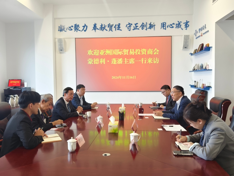 11月16日上午,亚洲国际贸易投资商会蒙德利·蓬潘主席一行来访,就2025年工作计划及泰国工业展、跨境电商洽谈会等合作事宜进行会谈。