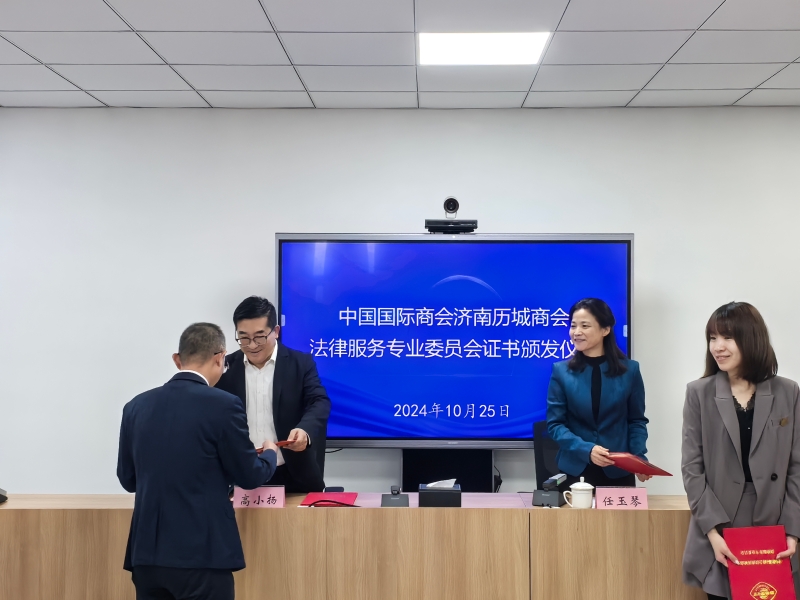 为进一步发挥联通政企、融通内外、畅通供需功能,更好地为企业提供精准法律服务,10月25日,济南市贸促会与历城区贸促会共同举办“中国国际商会济南历城商会法律服务专业委员会揭牌仪式暨企业出海合规培训会”。市贸促会党组成员高小扬到会参加法律服务专业委员会揭牌仪式,并为历城商会法律服务专业委员会成员山东润铭会计师事务所等6家单位颁发证书。会后,区贸促会(国际商会)会长任玉琴陪同高小扬到山东齐鲁国际能源交易中心和山东厚朴生物技术有限公司等企业调研,了解企业生产经营情况,介绍贸促会商事法律服务工作开展情况,法律事务部派员参加。